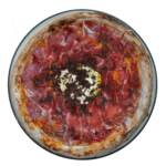 Base de tomate con mozarella fior di late, tomate cherry, jamón dulce ibérico, burrata y salsa de pesto.