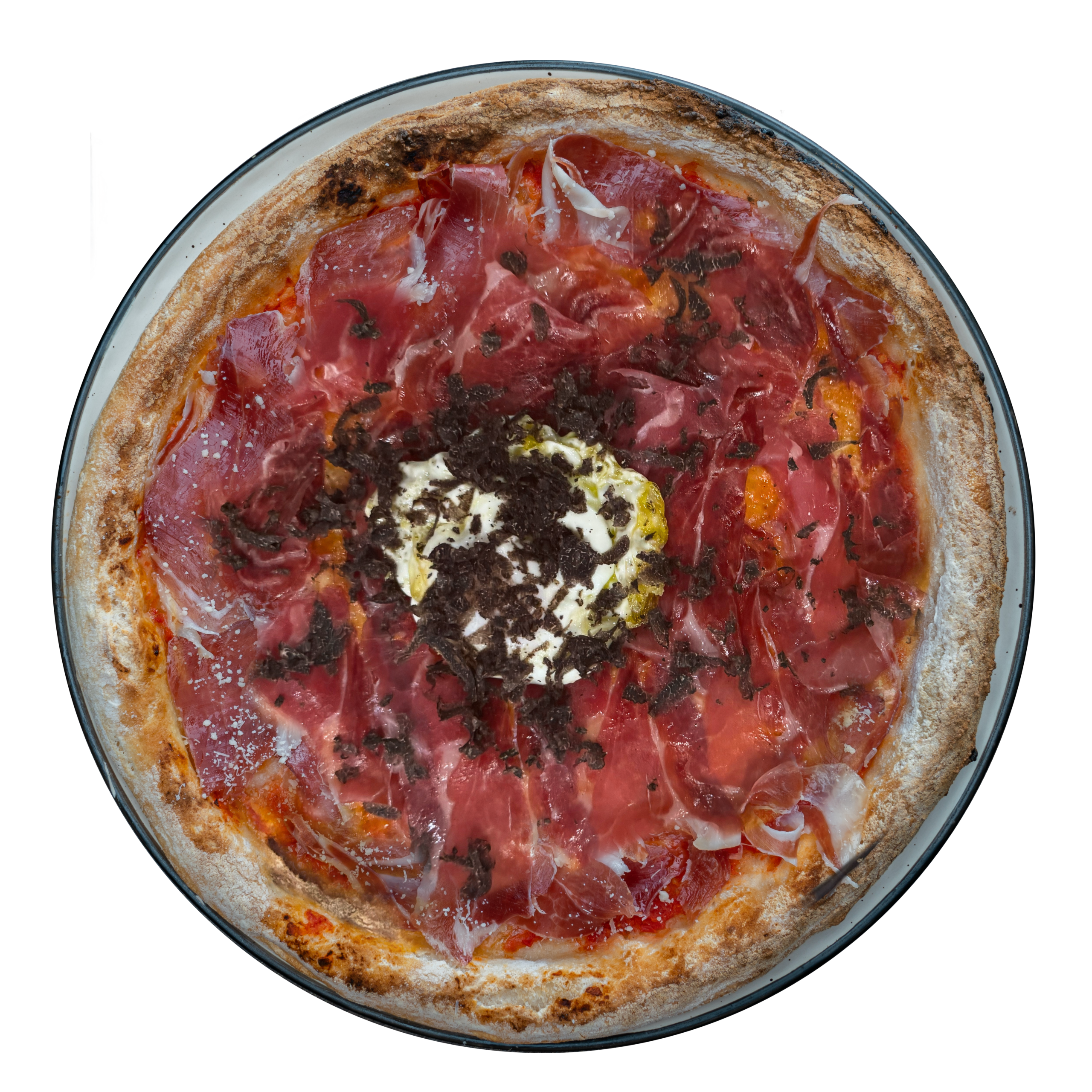 Base de tomate con mozarella fior di late, jamón ibérico, huevo frito y trufa melanosporum.